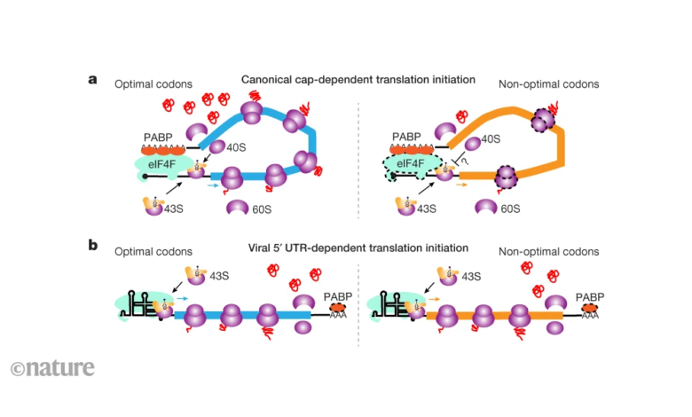 كان السؤال الذي طال أمده هو كيف يمكن للحمض النووي الريبوزي الفيروسي الذي يستخدم رموزًا وراثية مختلفة عن تلك المستخدمة في الخلايا البشرية أن يستمر في تحفيز إنتاج البروتين الفيروسي بكفاءة أثناء العدوى. يتبين أن تسلسلات المناطق غير المترجمة 5′ في RNA الفيروسي تقود إلى ترجمة مستقلة عن استخدام الكودون عن طريق منع تعميم mRNA، مما يمكّن الفيروسات من تجنب التحكم في استخدام الكودون المضيف للترجمة.